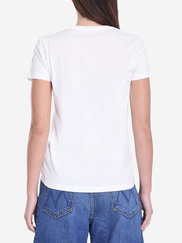 Short-sleeved crewneck t-shirt in white cotton with Moncler patch on left sleeve. Regular fit. The model is 176cm tall and wears a size XS.