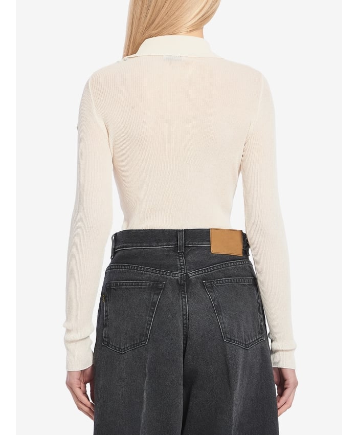 Long-sleeve polo shirt in semi-transparent fine ribbed cotton-blend knit in white. It features a classic collar, a three-button placket, and a ribbed