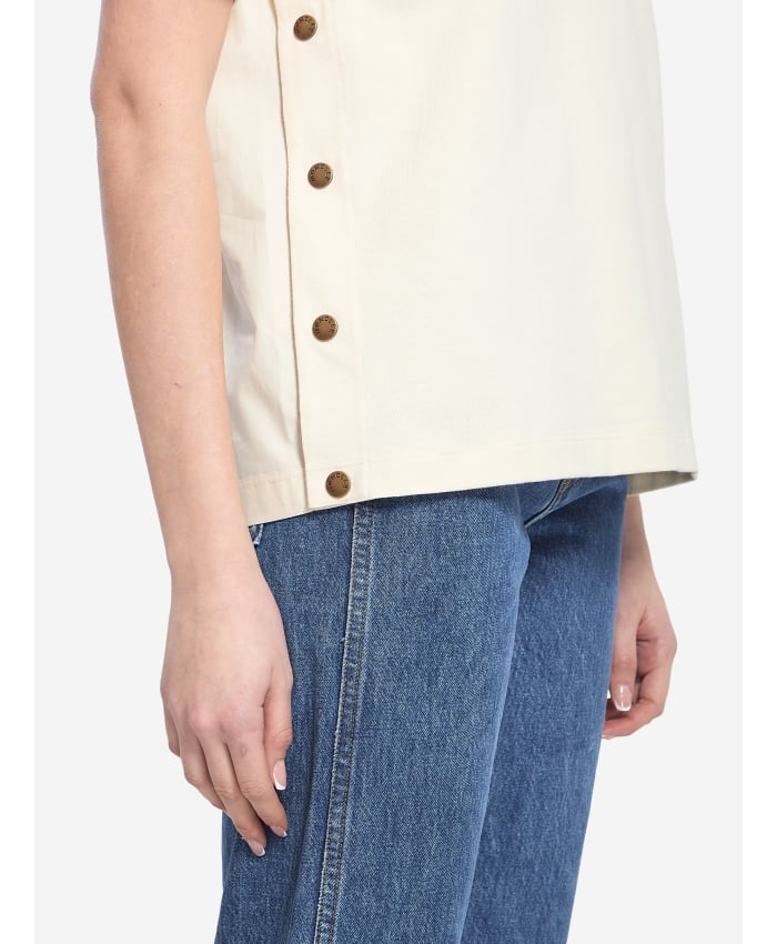 Crew-neck t-shirt in white cotton jersey with short sleeves. It features a patch pocket on the chest, side openings with logo snap buttons, a Moncler