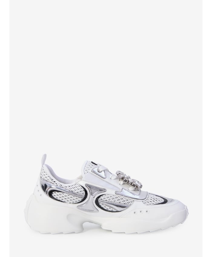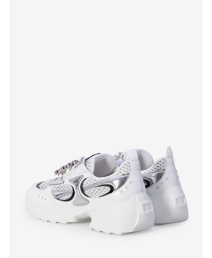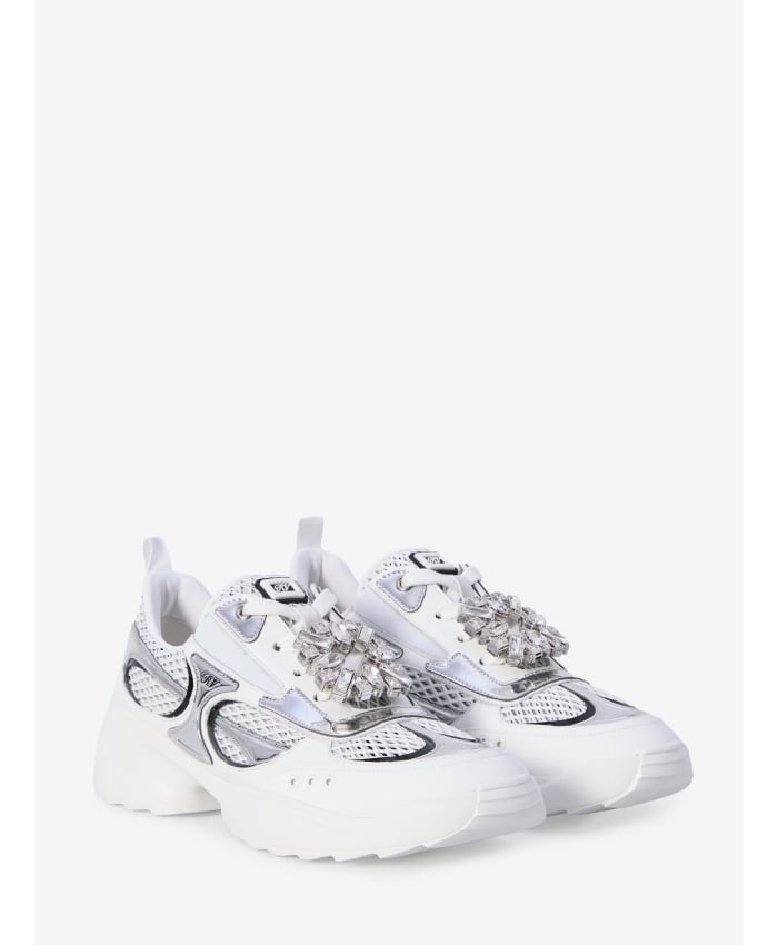 Viv' on the Run sneakers in white leather and silver mirror-effect fabric. They feature white mesh inserts, black details, lace-up closure, a