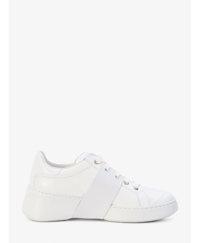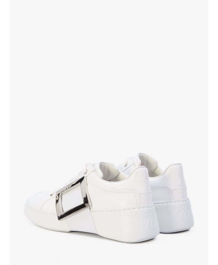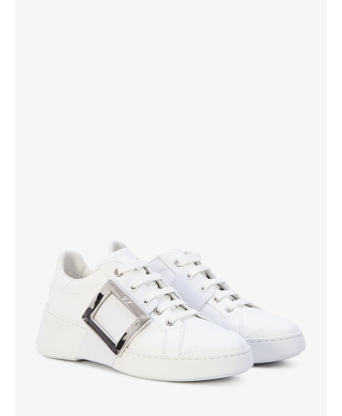 Viv' Skate sneakers in white leather with square metal buckle. They feature shiny leather insert on toe, lace-up closure, embossed RV logo on