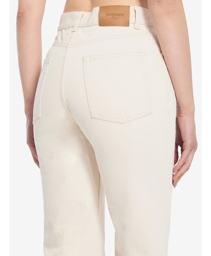 70s high-waisted jeans in milky white cotton denim. They feature a button and zip closure, belt loops, five pockets, boot-cut flared legs, and a