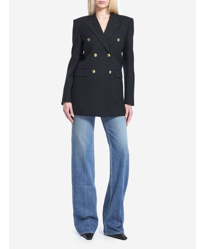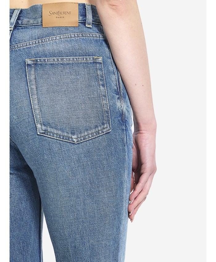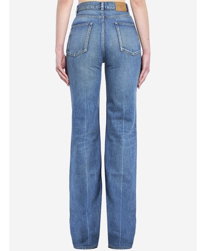 70s high-waisted jeans in blue denim. They feature a button and zip closure, belt loops, five pockets, boot-cut flared legs, and a beige leather logo