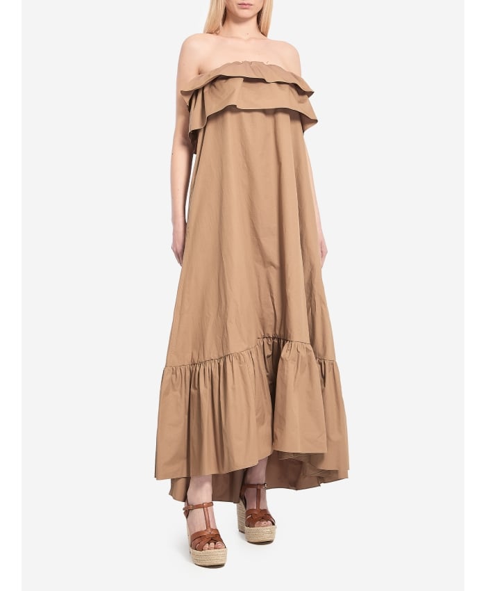 Maxi bustier dress in beige cotton twill, sleeveless. It features an elasticized neckline with double ruffles and an asymmetric country-style skirt
