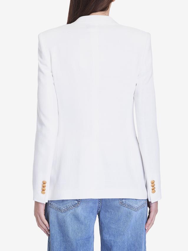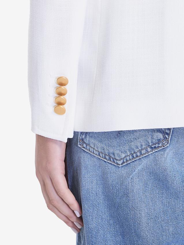 Double-breasted blazer in white fabric. It features peak lapels, a double-breasted closure with gold buttons, two front flap pockets with buttons,