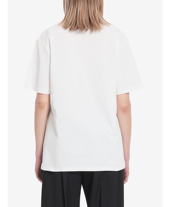 White cotton jersey short-sleeve crewneck t-shirt. It features a Chez Valentino print in black on the chest, with a ribbed neckline. The model is