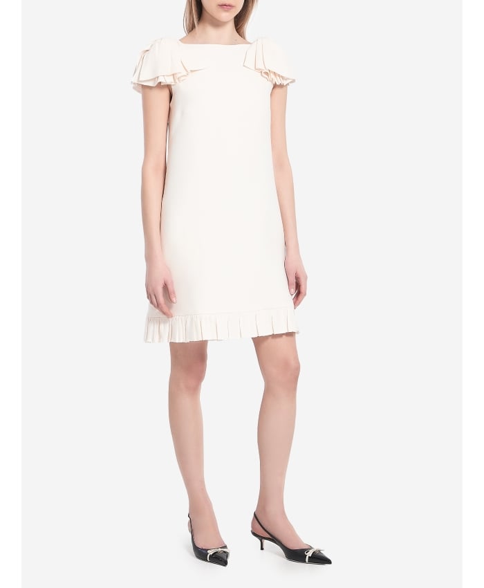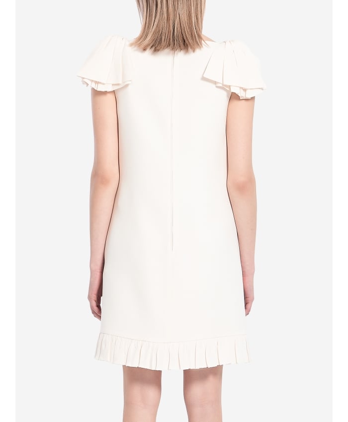 Short sleeveless dress in ivory Crepe Couture silk and wool blend. It features a boat neckline, bows on the shoulders, two side-seam pockets, a back