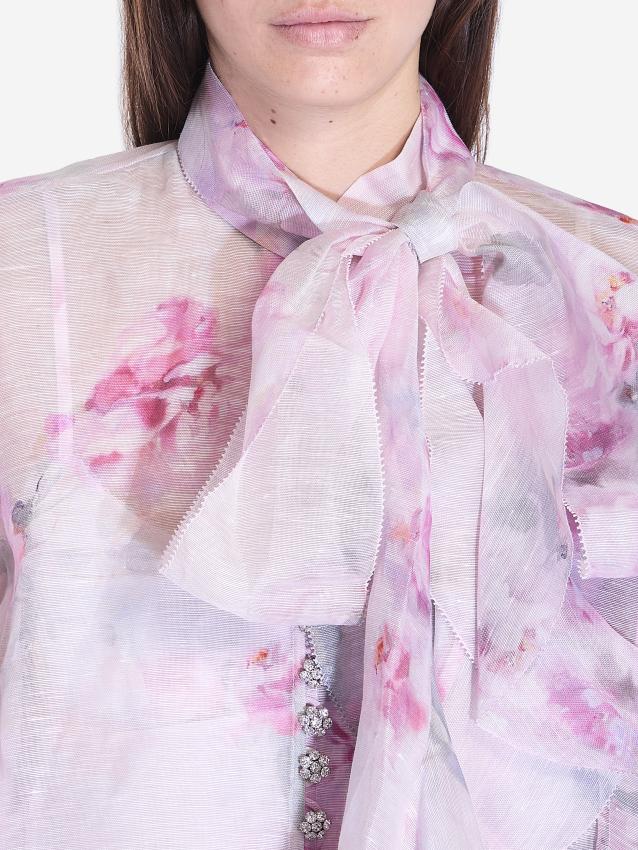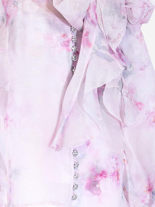 Semi-sheer Crush blouse with ruffles and a neck tie in pink silk and linen fabric with a floral print. It features floral button closures with