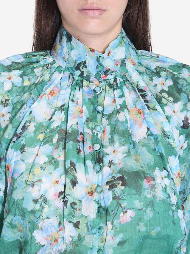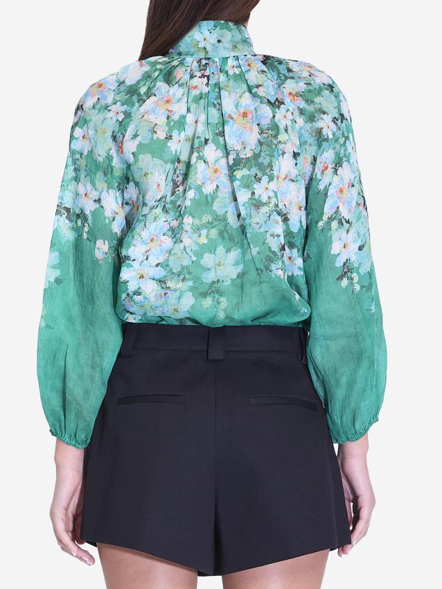 Everley blouse in green ramie with a floral print. It features a high collar with gathering, button closure covered in fabric with cord tie loops,