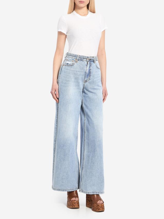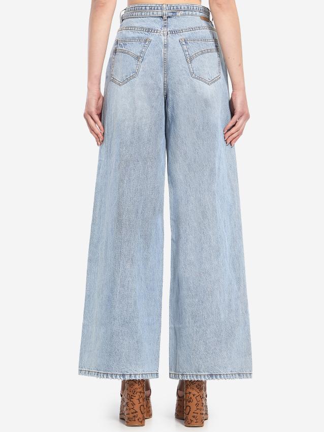 High-waisted Illuminate flare jeans in light blue Sea Foam denim. They feature a button closure with a logo and zip, belt loops, a removable and