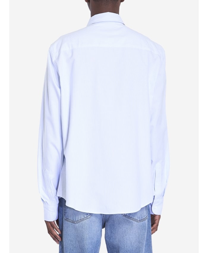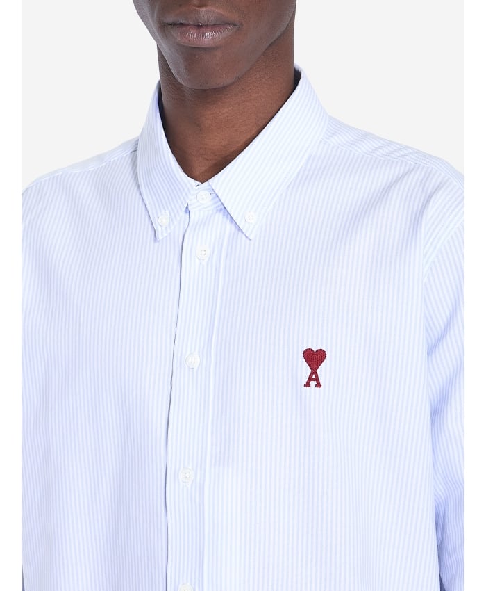 Striped white and light blue cotton shirt with red Ami De Coeur embroidery on the chest. It features a pointed button-down collar, front button