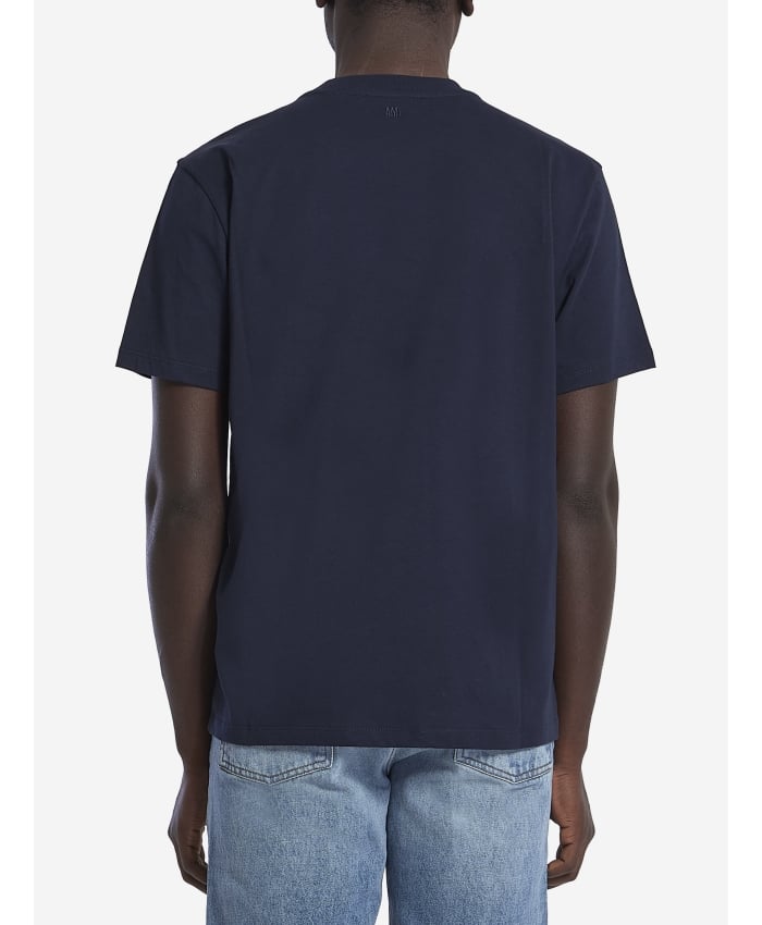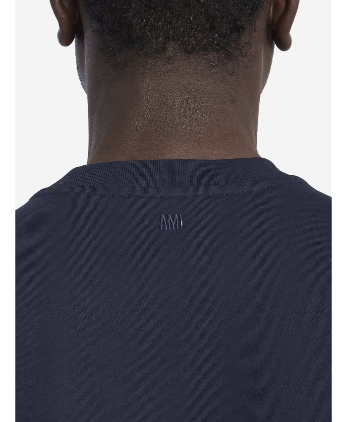 Short-sleeved crewneck t-shirt in midnight blue cotton. It features a white embroidered Ami de Coeur logo on the chest, a tone-on-tone AMI logo