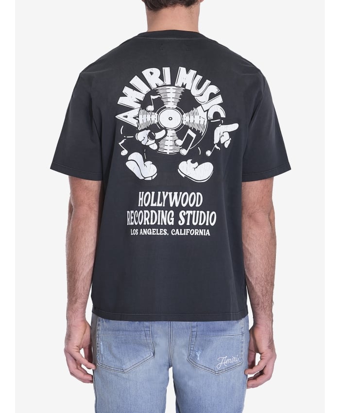 Black cotton short-sleeve crewneck t-shirt. It features a small white Amiri Music Record logo on the chest, a large Amiri Music Record logo print on