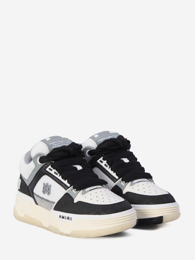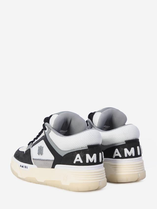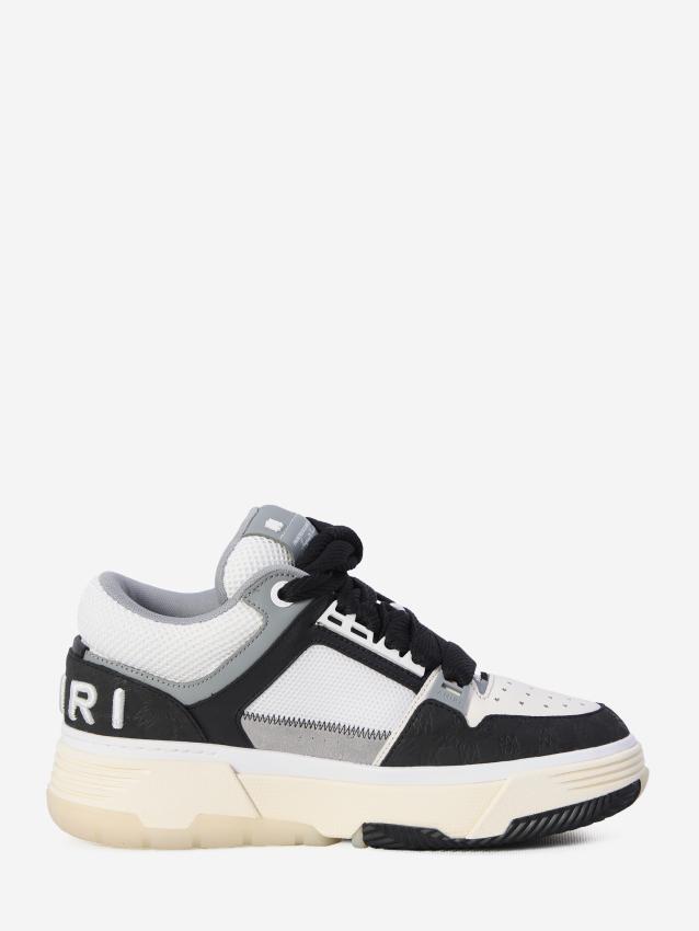 MA-1 sneakers in black and grey leather with white mesh and grey suede inserts. They feature an all-over Amiri logo embossed in black leather on the