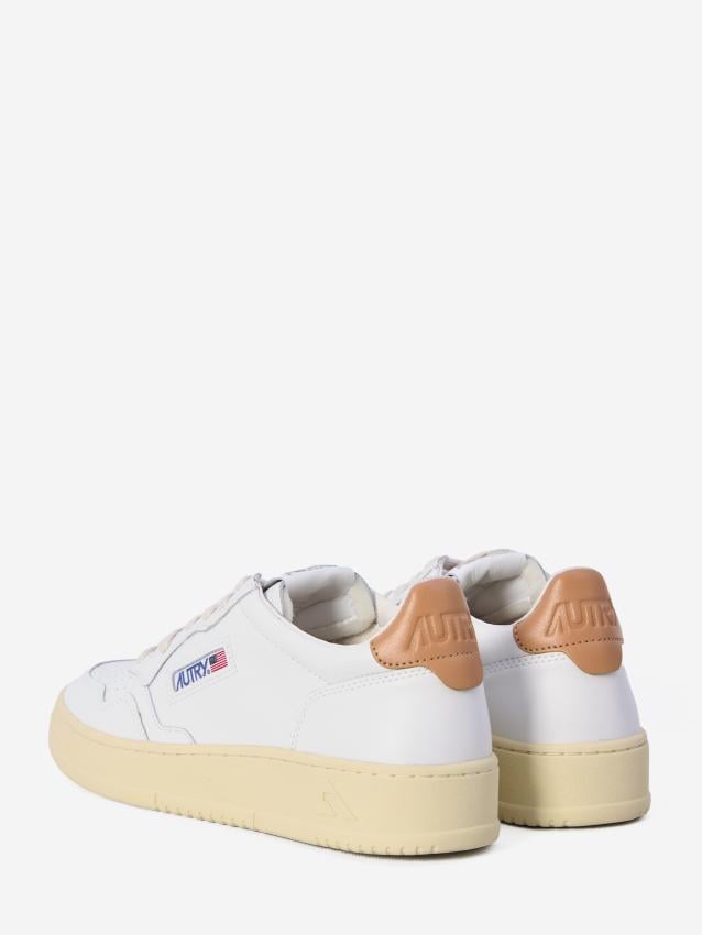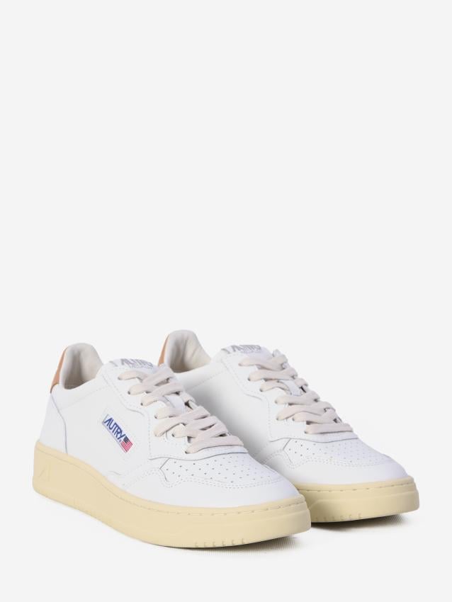 Low Medalist sneakers in white leather with a sand colored detail on the heel and a rubber sole. Featuring a lace-up closure, perforated toe, blue