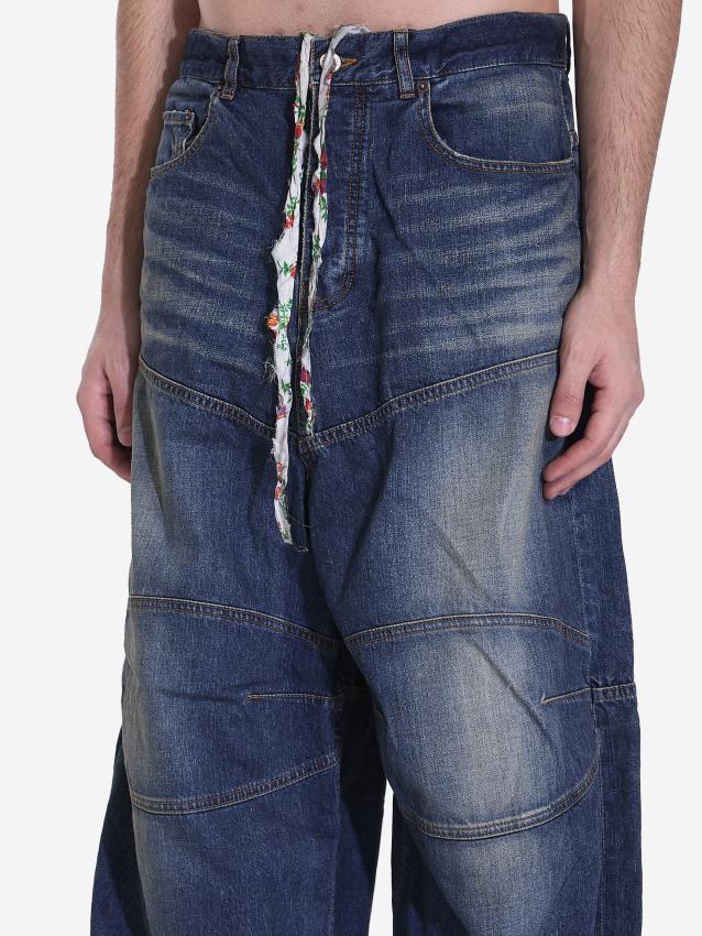 Baggy blue cotton jeans. They feature a button closure, five pockets, belt loops, a floral silk drawstring inside the waistband for adjustment, a low
