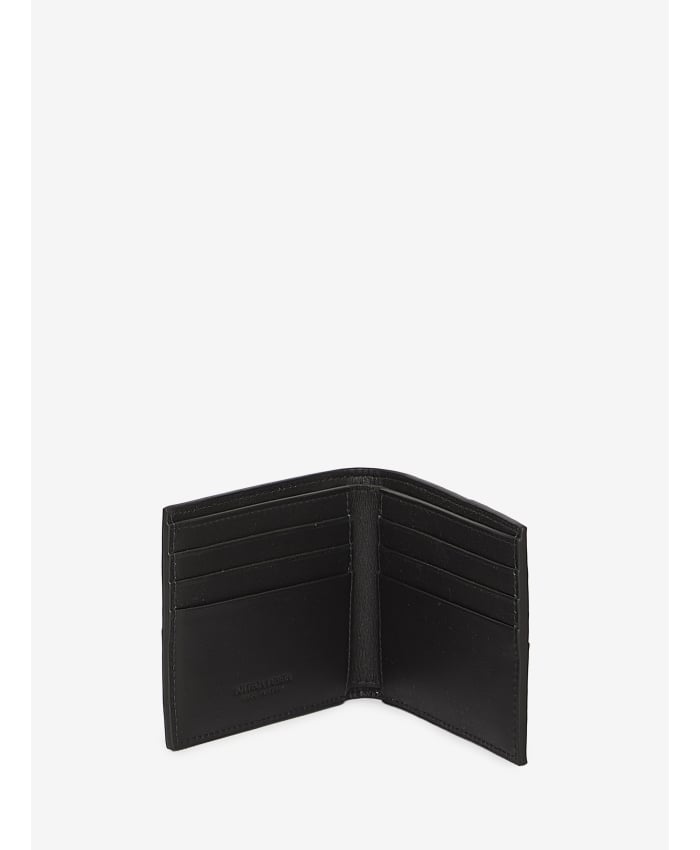 Cassette bi-fold wallet in black leather with Intrecciato pattern. It features one bill compartment, six card slots and two additional slip pockets.