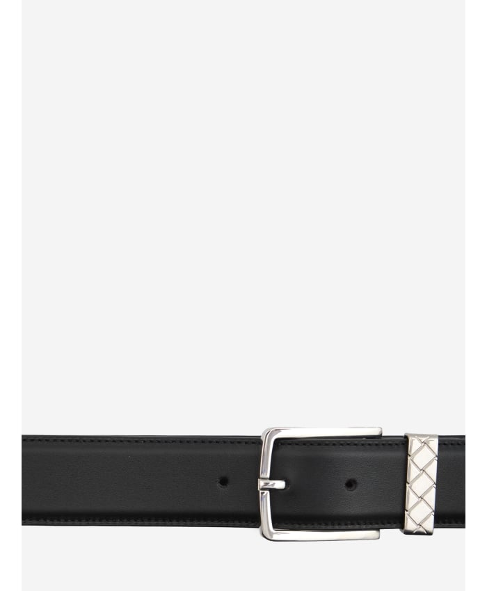Intreccio Loop belt in black calfskin leather featuring a metal loop with an Intreccio motif and a silver-tone metal buckle. Dust bag included. Any