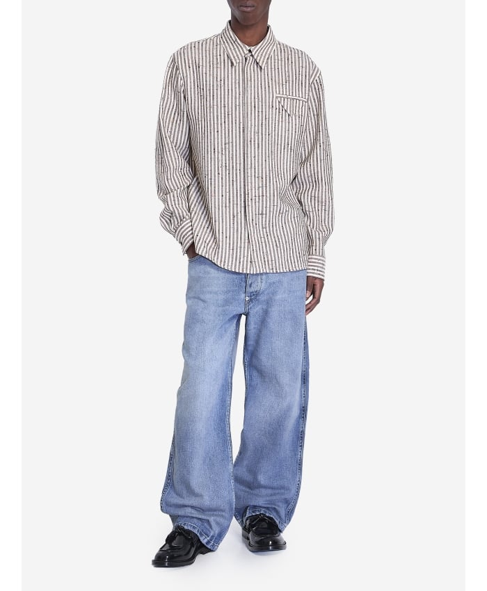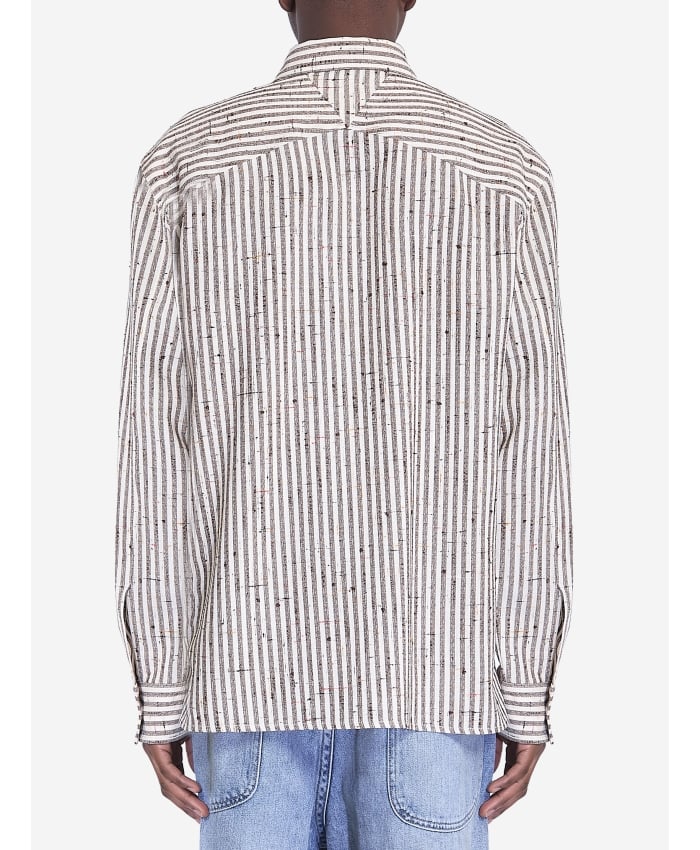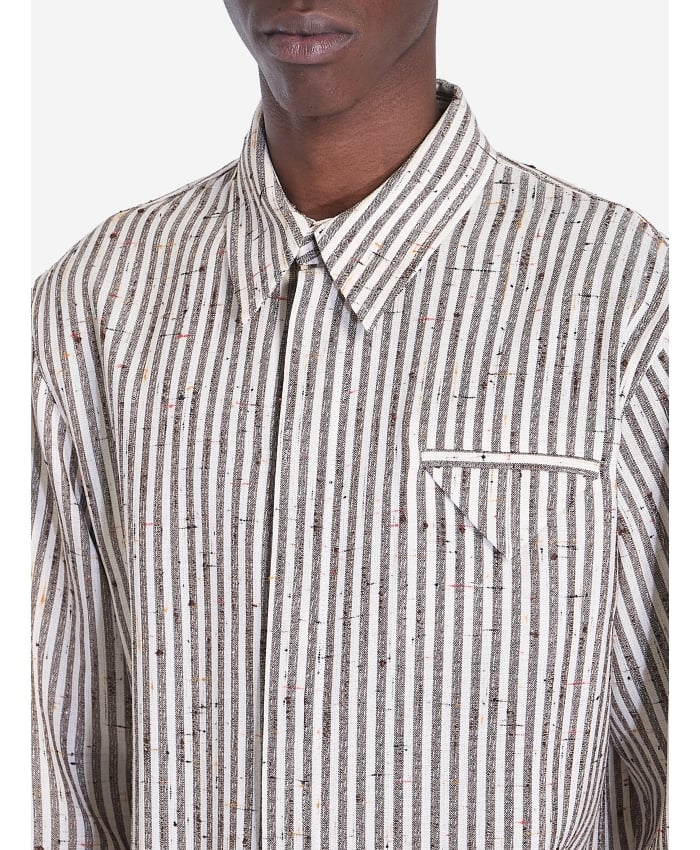 Silk and viscose shirt with a white and brown striped knot pattern. It features a pointed collar, hidden button front closure, a chest pocket with a