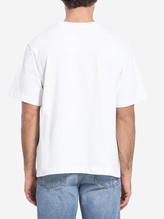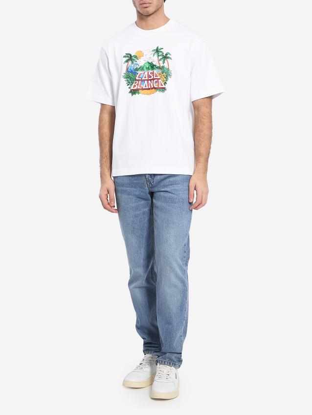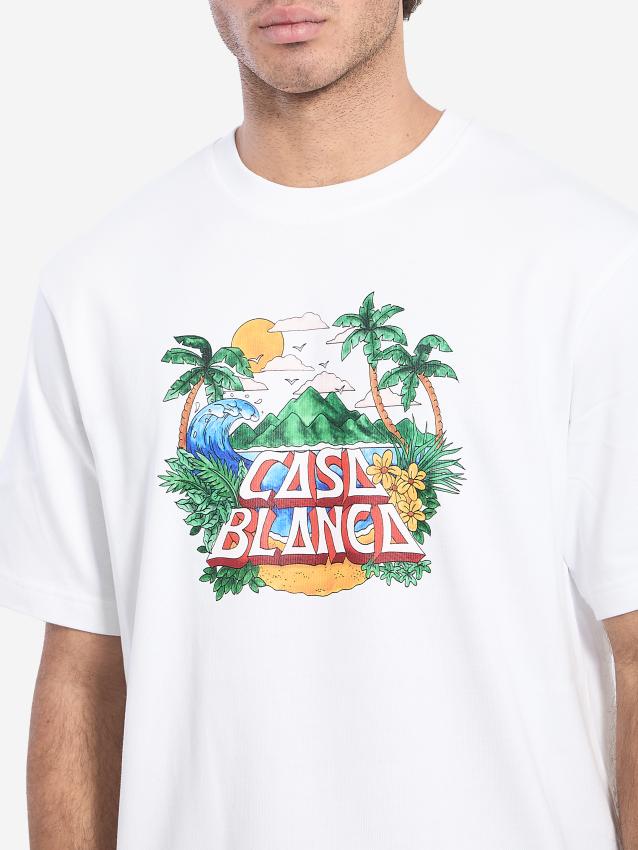 Casa Beach Wave short-sleeved crewneck t-shirt in white cotton. It features a Casa Beach Wave print on the chest and a ribbed crewneck. The model is