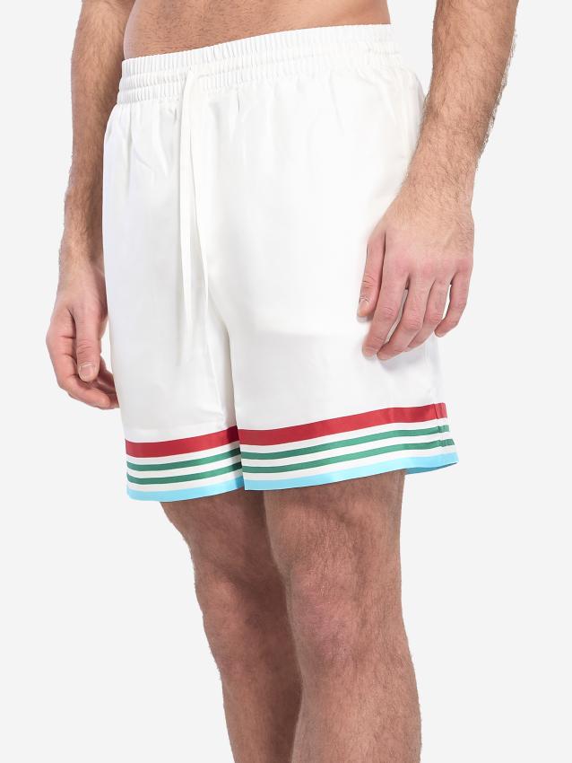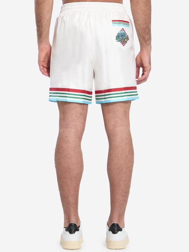 Casa Way World Series bermuda shorts in white silk twill. They feature an elastic waistband with a drawstring, two side pockets, a back pocket with a