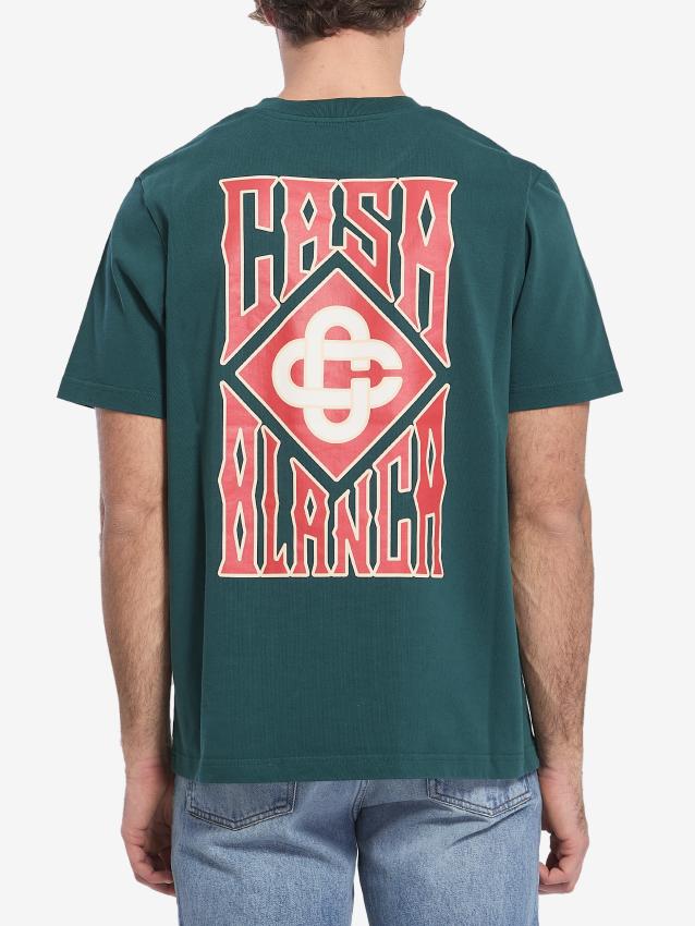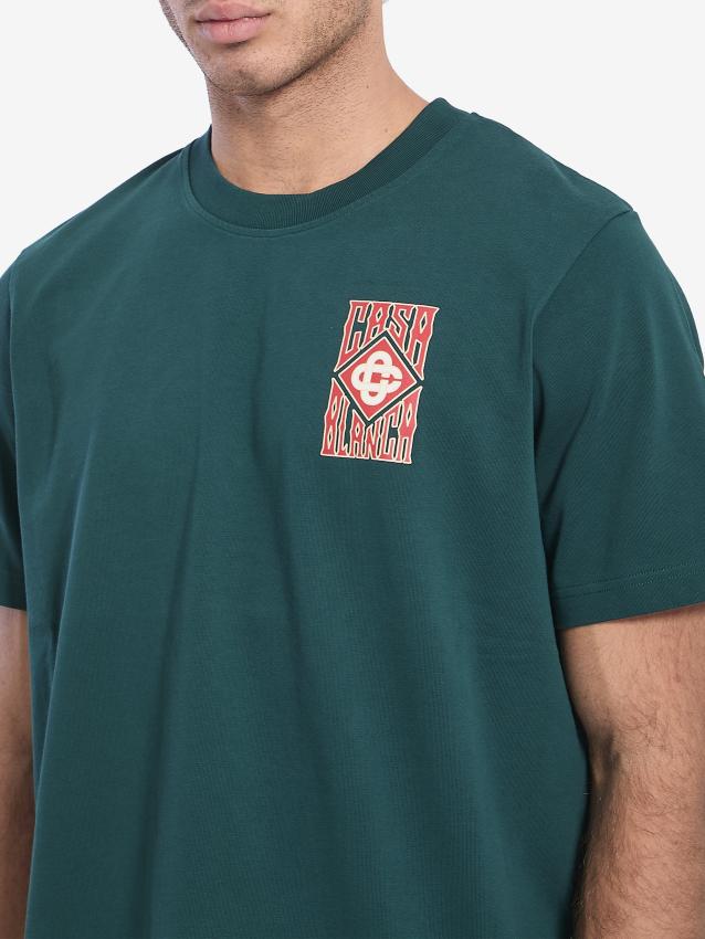 Dark green cotton short-sleeve crewneck Gothic Casa Way t-shirt. It features the red Casablanca Gothic logo on the chest, a large red Casablanca