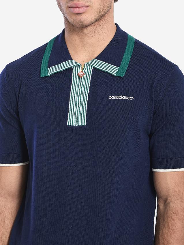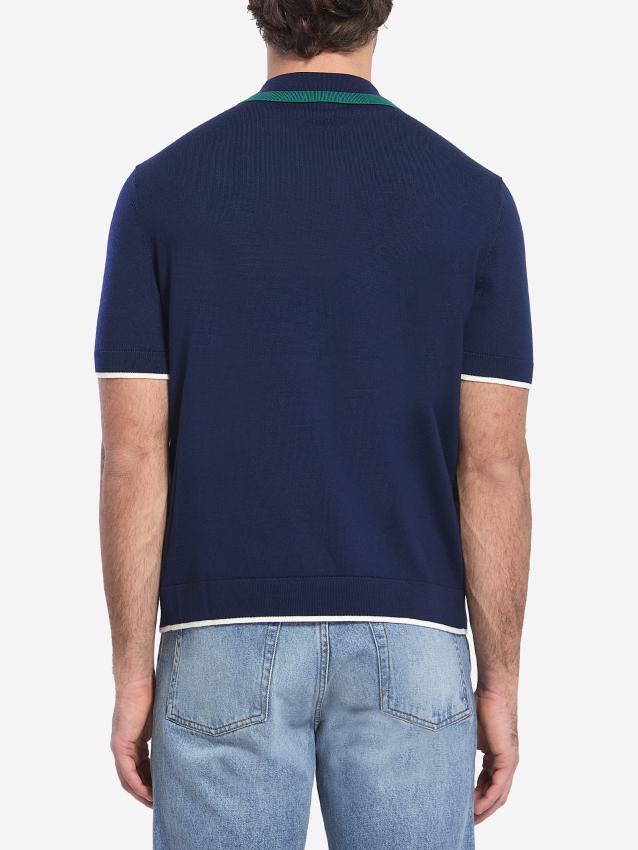 Short-sleeved tennis polo shirt in navy blue wool knit. It features a pointed collar with a dark green trim, green and white striped placket with a