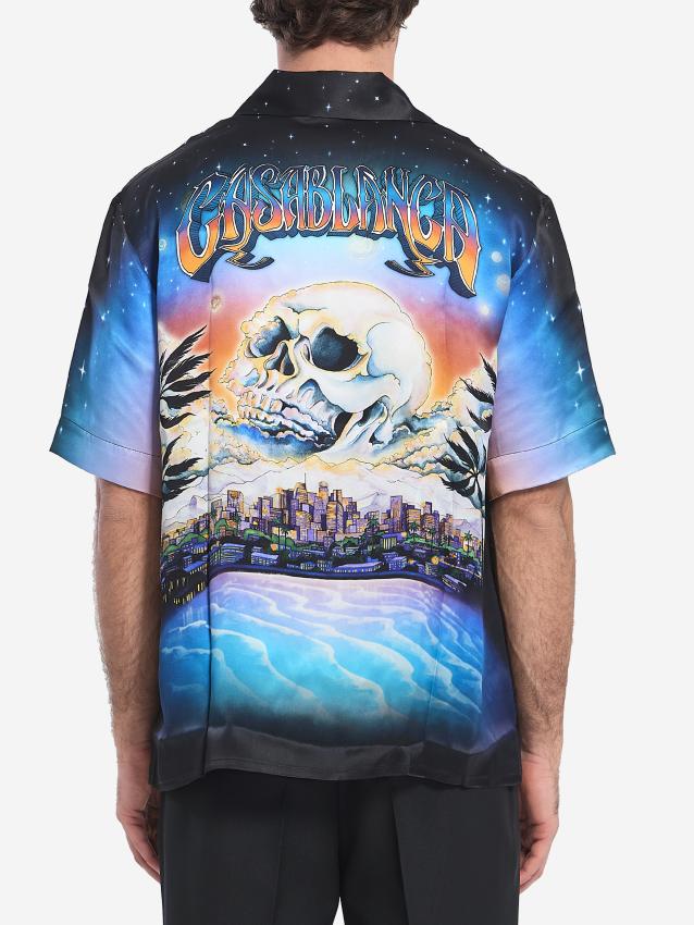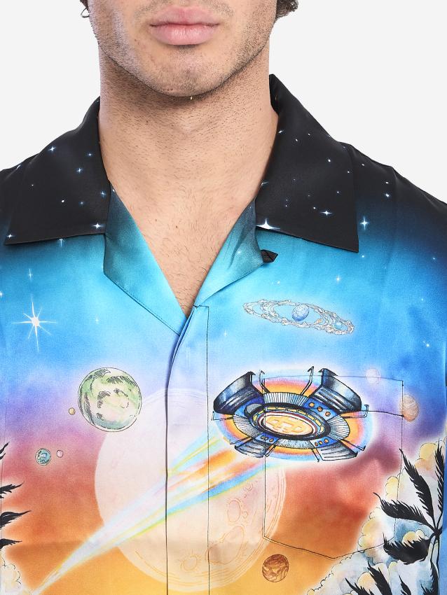 La Premonition short-sleeve satin silk shirt with a multicolor sci-fi print. It features a Cuban collar, hidden button closure, a chest pocket,
