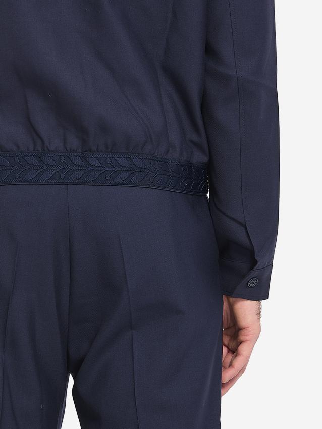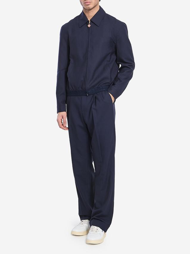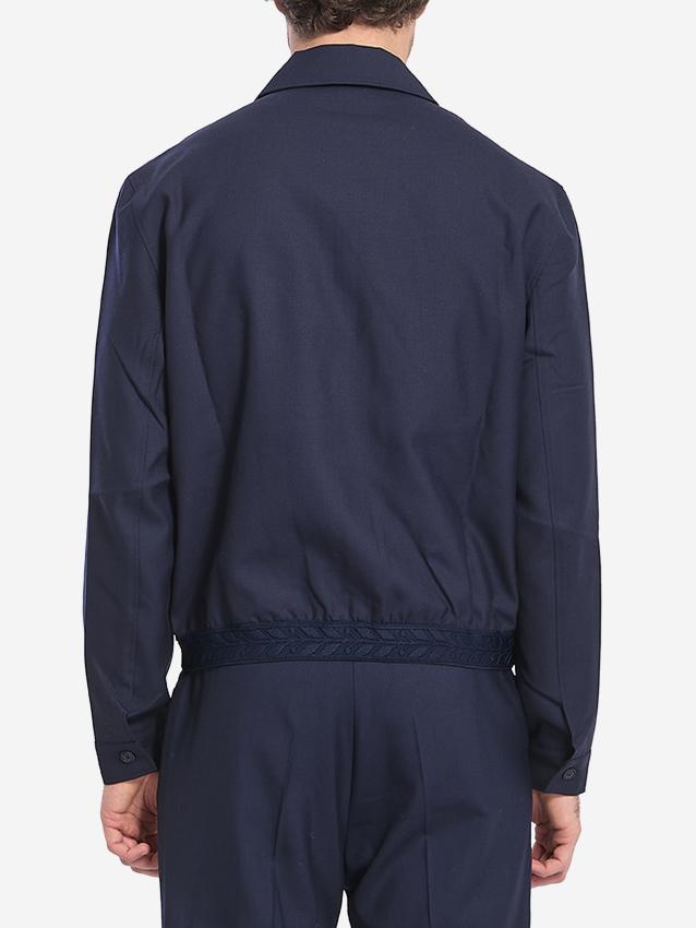 Sports tailoring jacket in navy blue wool. It features a pointed collar, zip closure with a diamond-shaped zipper pull with Monogram, two welt side