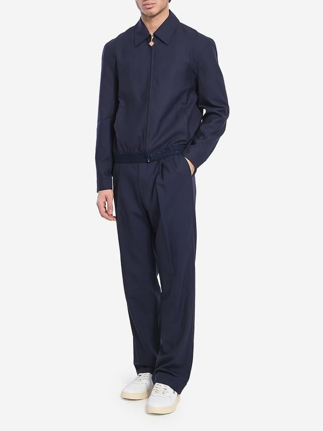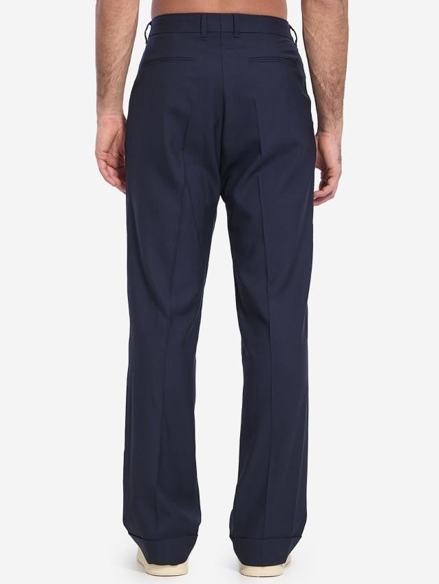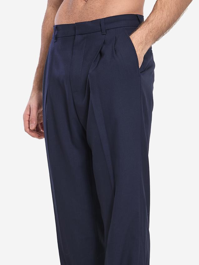 Tailored blue wool trousers. They feature a hook, button, and zip closure, front pleats, two side pockets, two welt back pockets, belt loops, and