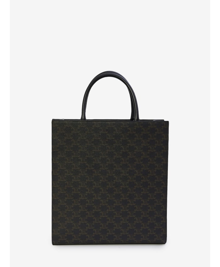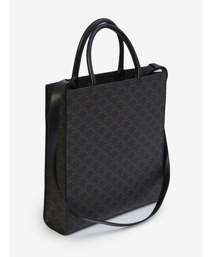 Cabas Medium bag in Triomphe canvas in the shades of black with leather trims and white Celine logo printed on the front. It features fixed double