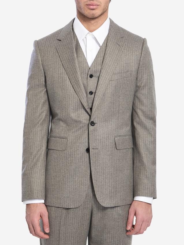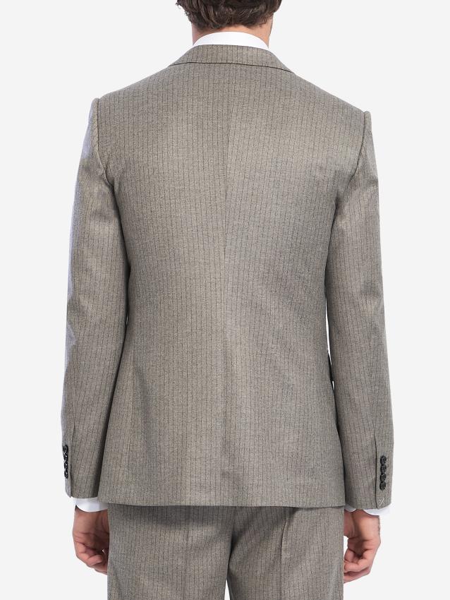 Single-breasted jacket in dark grey striped flannel. It features classic notched lapels, a two-button closure, a welt chest pocket, two front flap