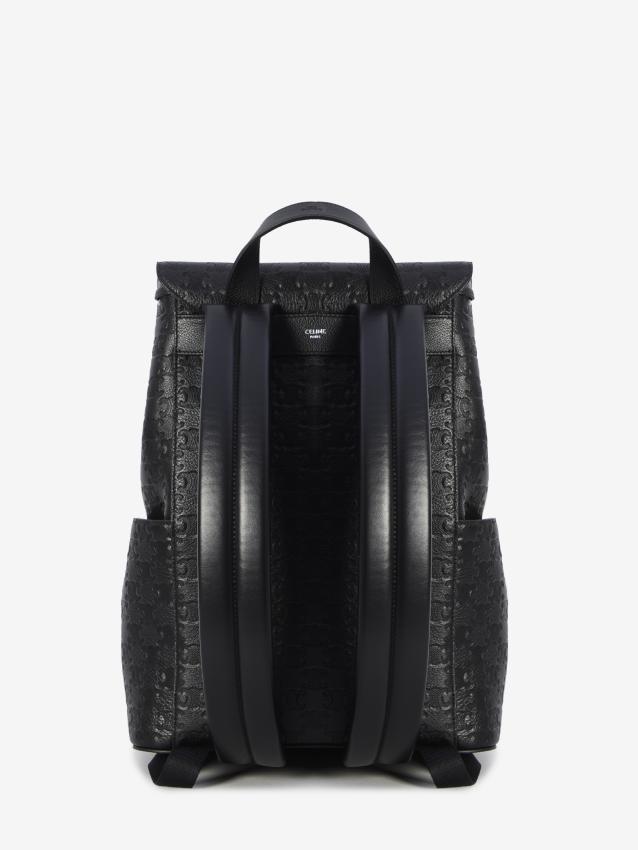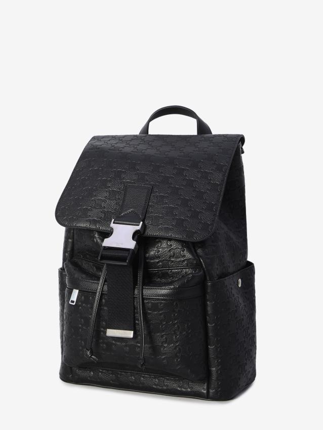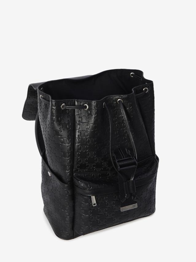 Black grained leather backpack with all-over Triomphe pattern. It features a buckle closure with engraved logo and drawstring, fixed adjustable
