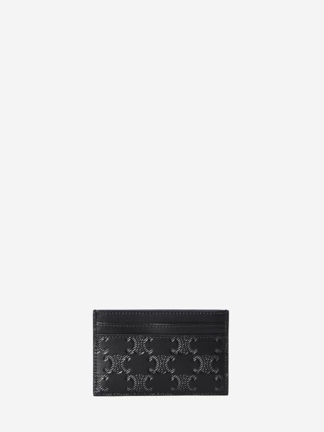 Black calfskin cardholder with Triomphe pattern and engraved logo on the front.It features four card slots and one flat pocket. Dust bag included.