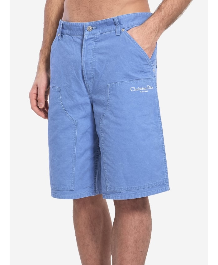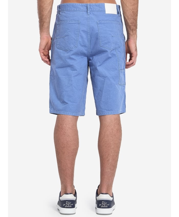 Cargo bermuda shorts in blue cotton denim. They feature a button closure, two side pockets, belt loops, two applied back pockets, cargo details on