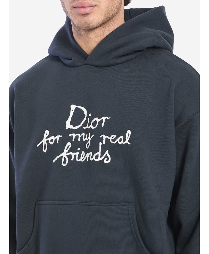 Dior and Hylton Nel hoodie in navy blue cotton fleece. It features a fixed hood, white Dior For My Real Friends embroidery on the chest, a front