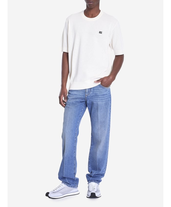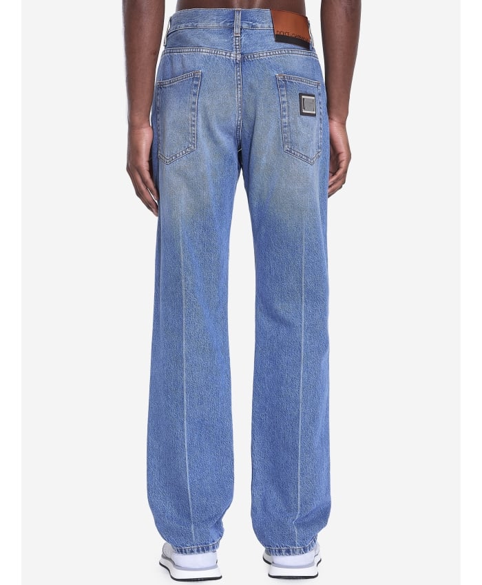 Classic blue denim jeans. They feature a button and zip closure, five pockets, belt loops, a Dolce & Gabbana label on the front coin pocket,