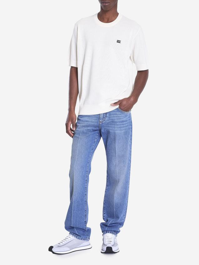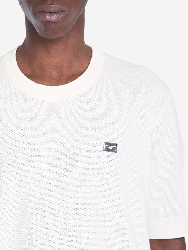 Crewneck short-sleeve t-shirt in textured white cotton. It features a metal logo plaque on the chest and ribbed neckline and hems. Regular fit.The