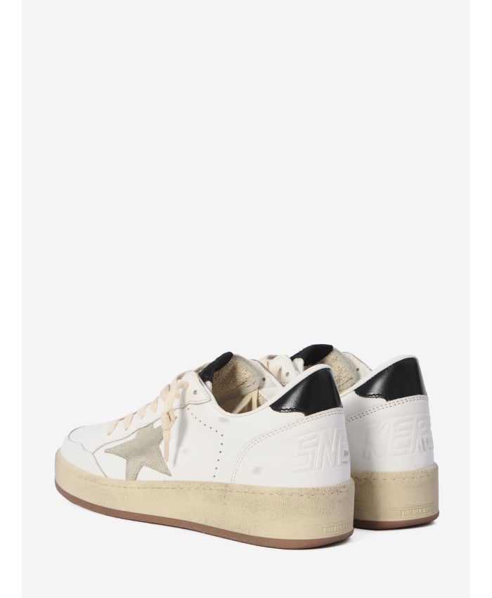 Ball Star sneakers in white leather with a lived-in effect. They feature a lace-up closure, perforated toe, gray suede star on one side, logo on the