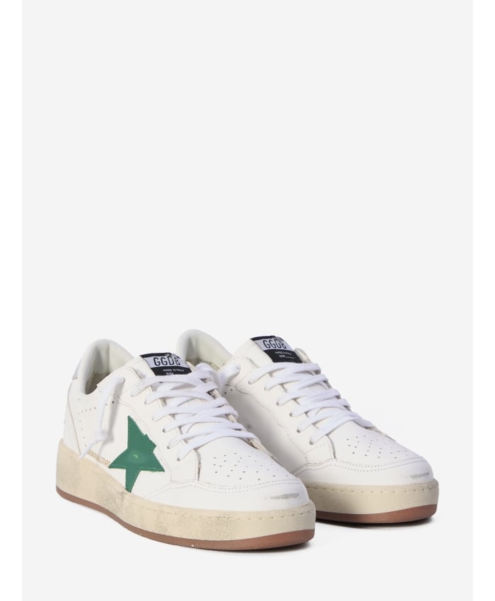 Ball Star sneakers in white leather with a worn effect. They feature a lace-up closure, a perforated toe, a green leather star on one side, a logo on