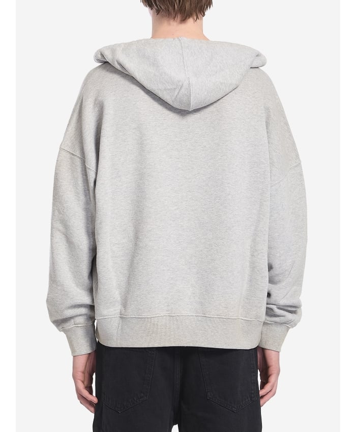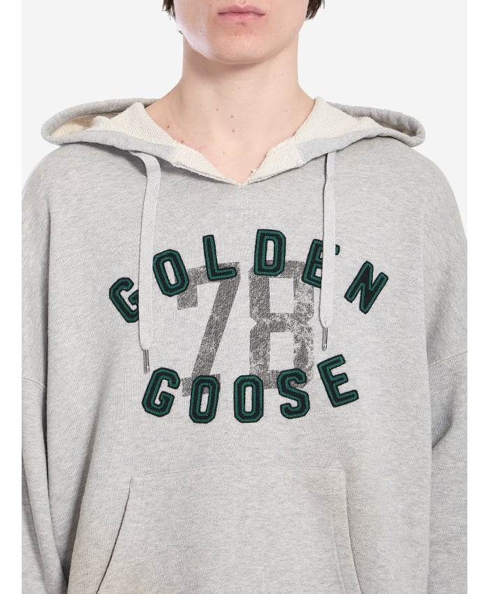 Hoodie in lived-in effect grey cotton. It features a drawstring hood, a V-shaped tear on the neckline, a Golden Goose embroidered logo in green and