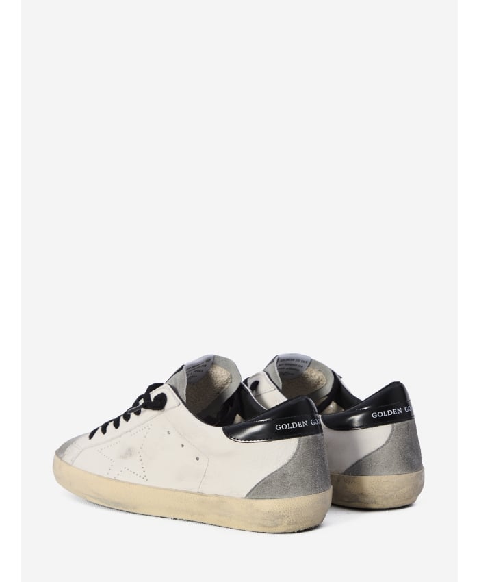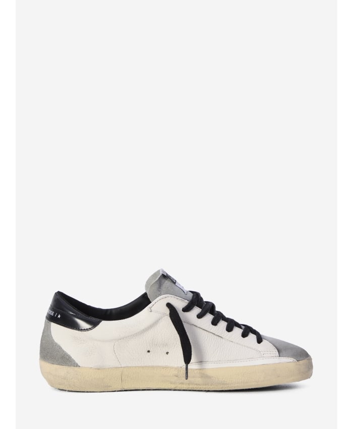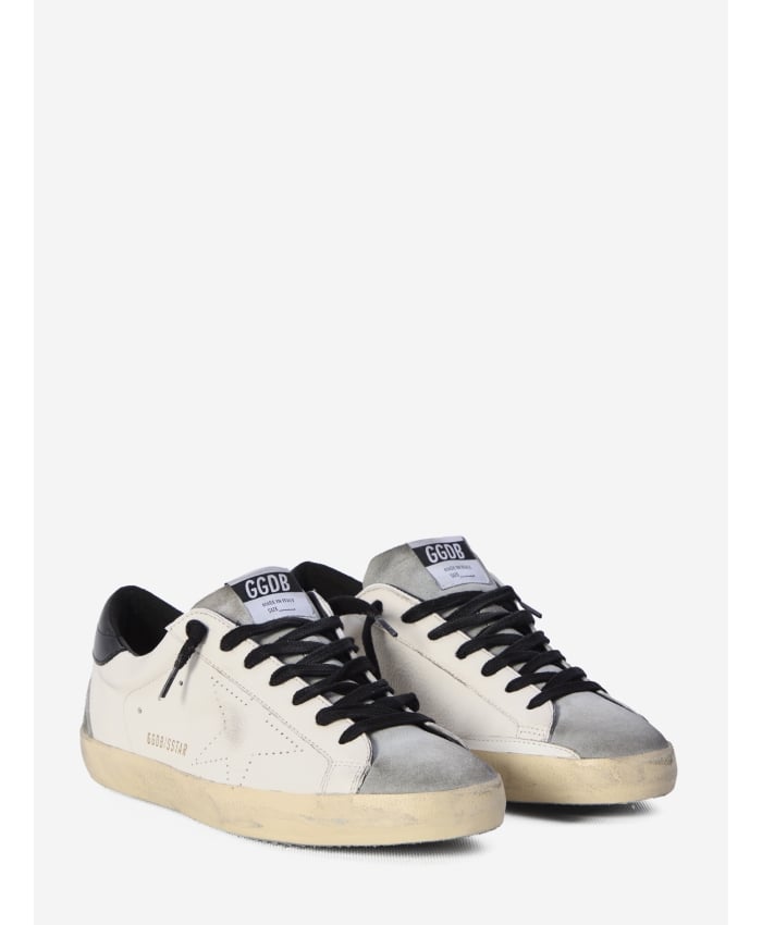 Superstar sneakers in white leather with a worn effect and grey suede. They feature a lace-up closure, a perforated star detail on the side, a