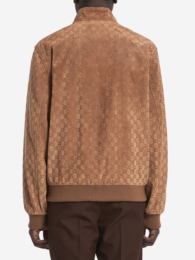 Camel suede calfskin bomber with an all-over embossed GG pattern. It features a collar with two buttons, zip closure, two side pockets with flaps and