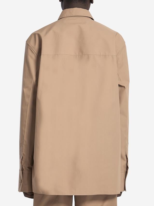 Beige cotton poplin shirt. It features a pointed collar, button closure, an embossed Gucci logo on the chest, and buttoned cuffs. Oversized fit.The