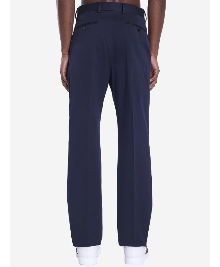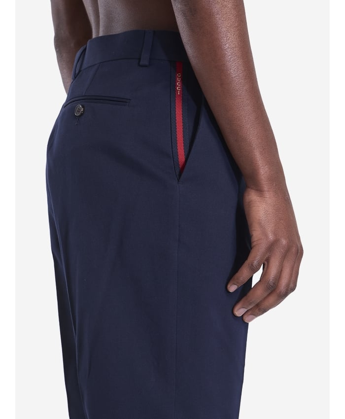 Straight-leg tailored navy blue cotton gabardine trousers with a blue and red Web ribbon detail on the pockets and a small gold-tone Gucci logo on