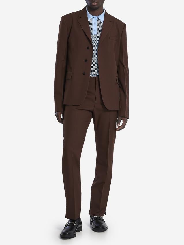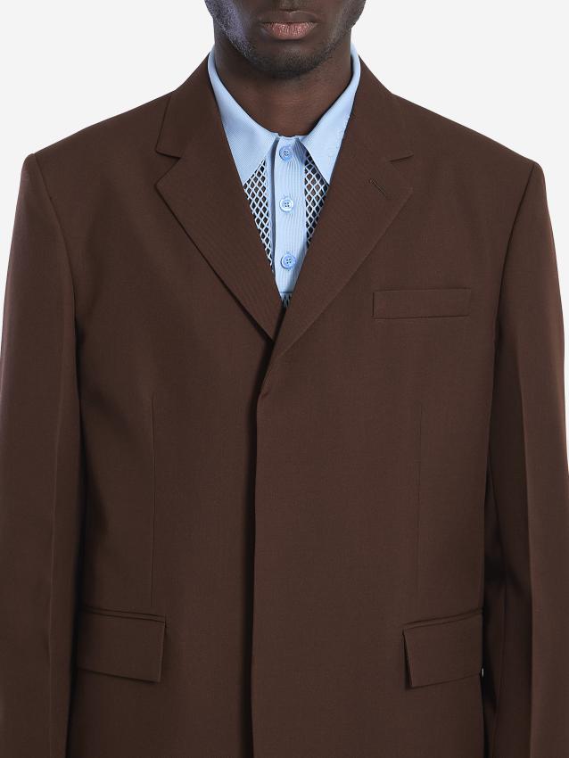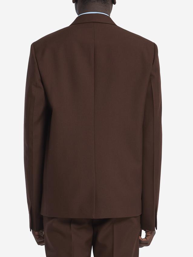 Single-breasted jacket in dark brown wool twill. It features notch lapels, hidden button closure, a welt chest pocket, two front flap pockets, an