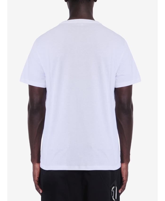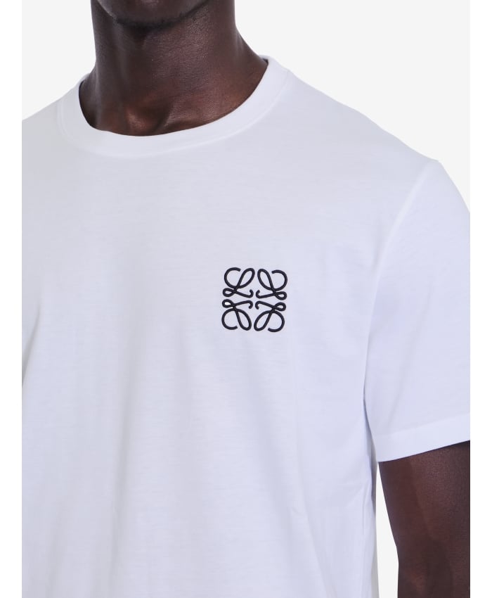 Short-sleeved crewneck t-shirt in white cotton with embroidered Anagram on chest. Ribbed collar. Regular fit. The model is 192cm tall and wears size
