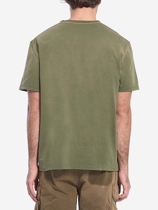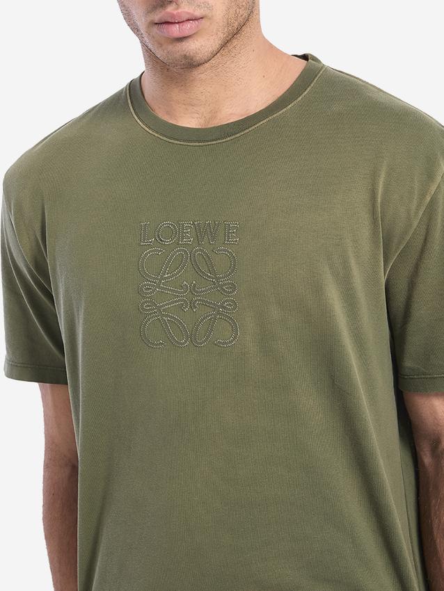 Short-sleeved crewneck t-shirt in khaki green cotton. It features a tonal embroidered Anagram motif and LOEWE logo on the chest, and a ribbed