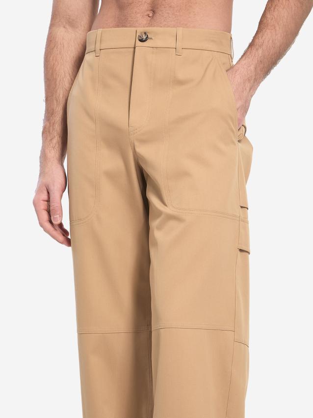 Cargo trousers in beige cotton-silk blend. They feature a button and zip closure, two side pockets, belt loops, one welt pocket at the back, and