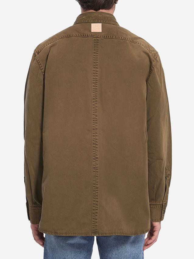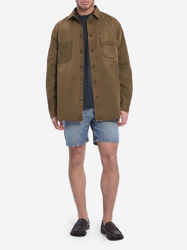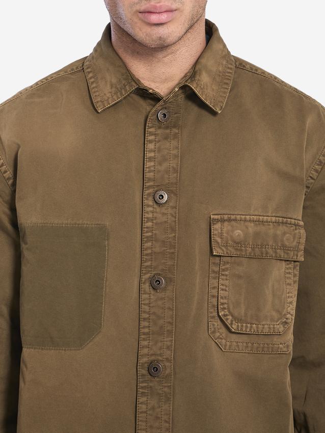 Overshirt in khaki green cotton. It features a pointed collar, metal button closure with an engraved logo, a flap pocket on the chest with snap